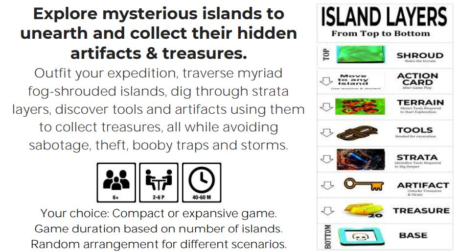 Secretly fill island pits with layers of cards: shroud, terrain, tools, strata, and artifact and/or treasure.