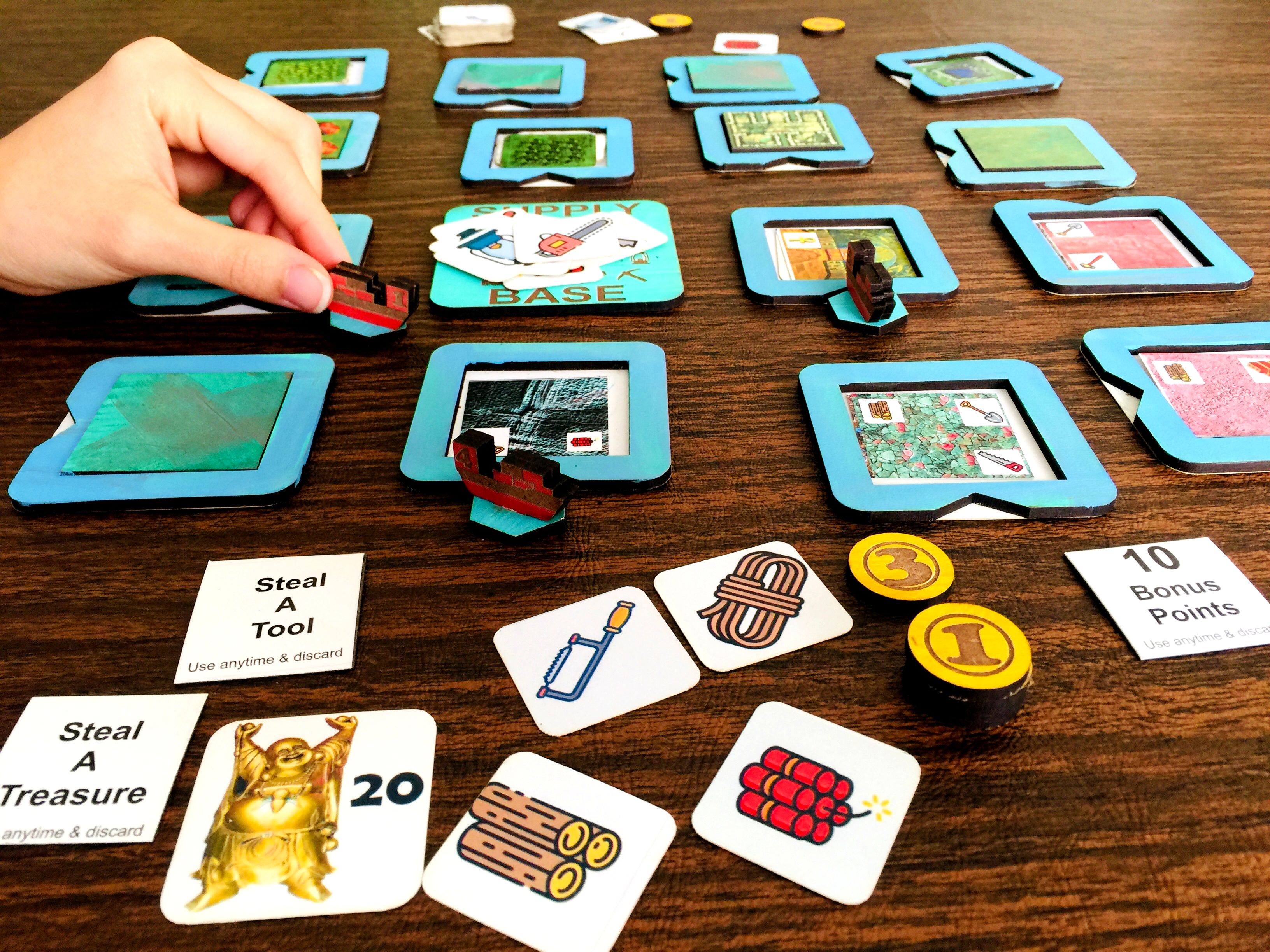 Excavate the layers to collect tools, action cards, artifacts and treasures